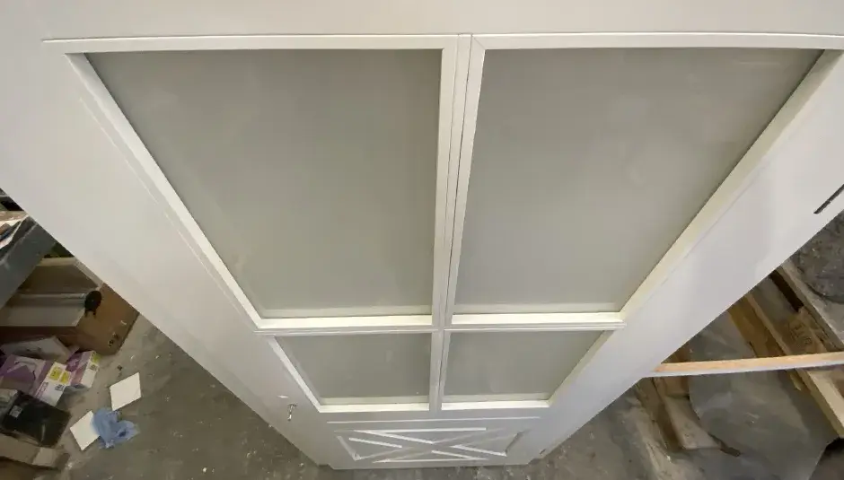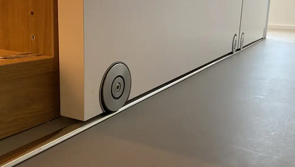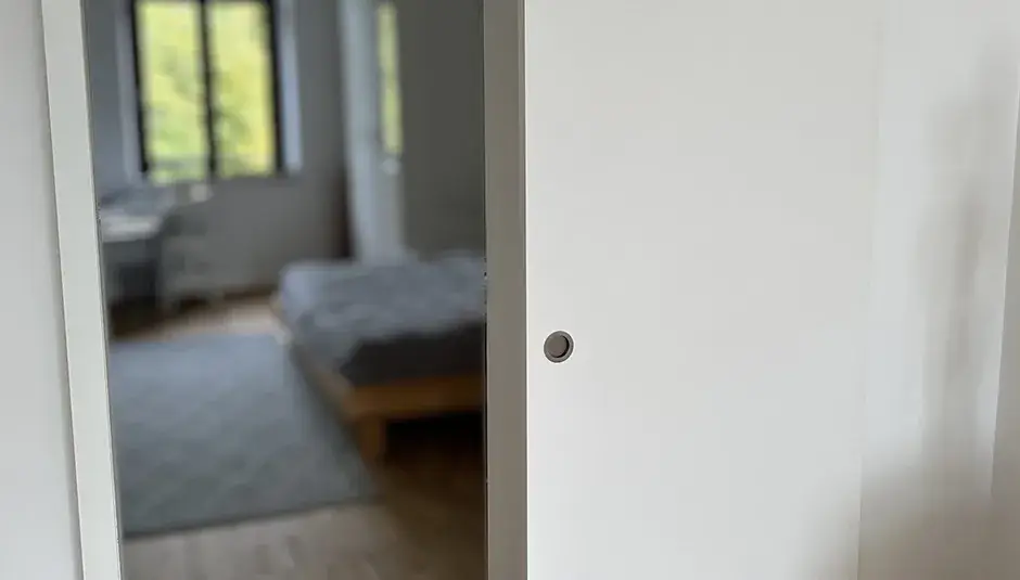 Hier haben wir ein Schiebetürelement mit stumpfem Türblatt, Laufschiene und Laufkasten weiss lackiert ...