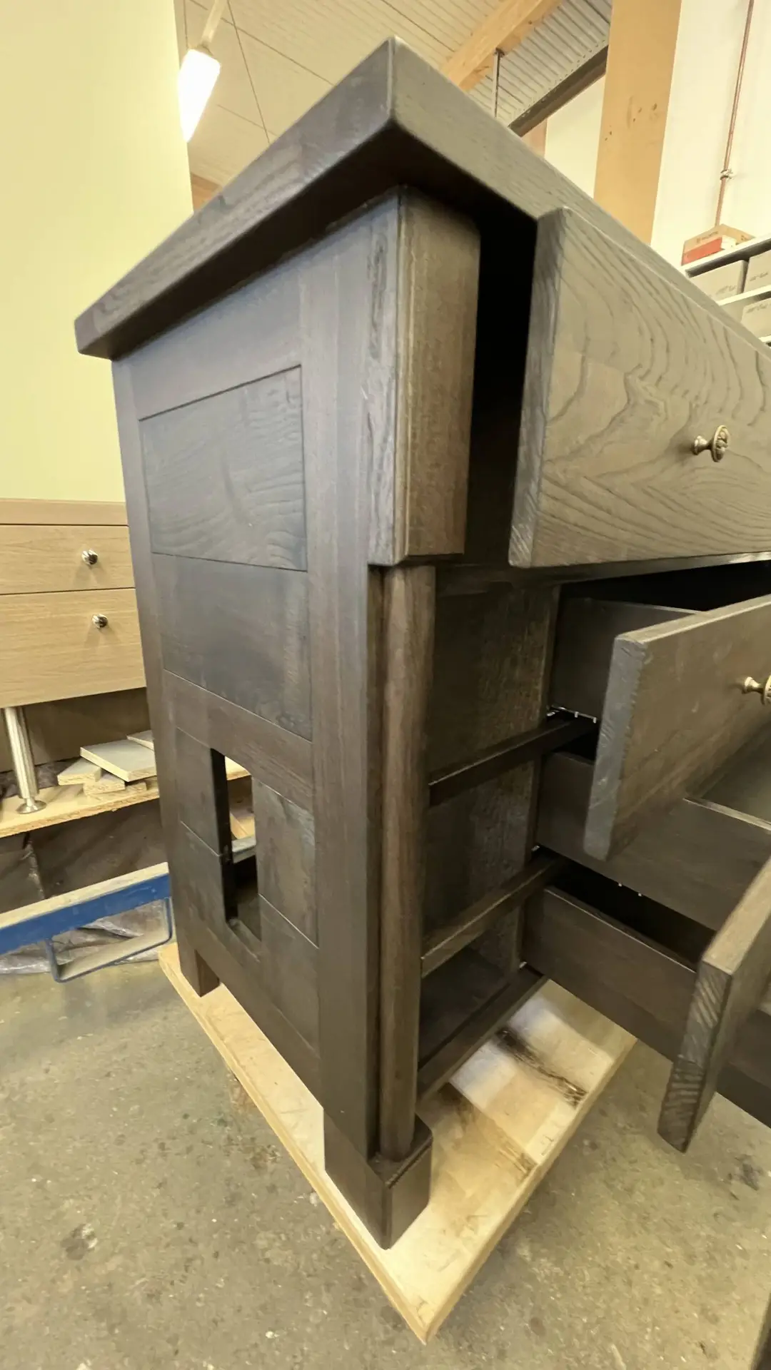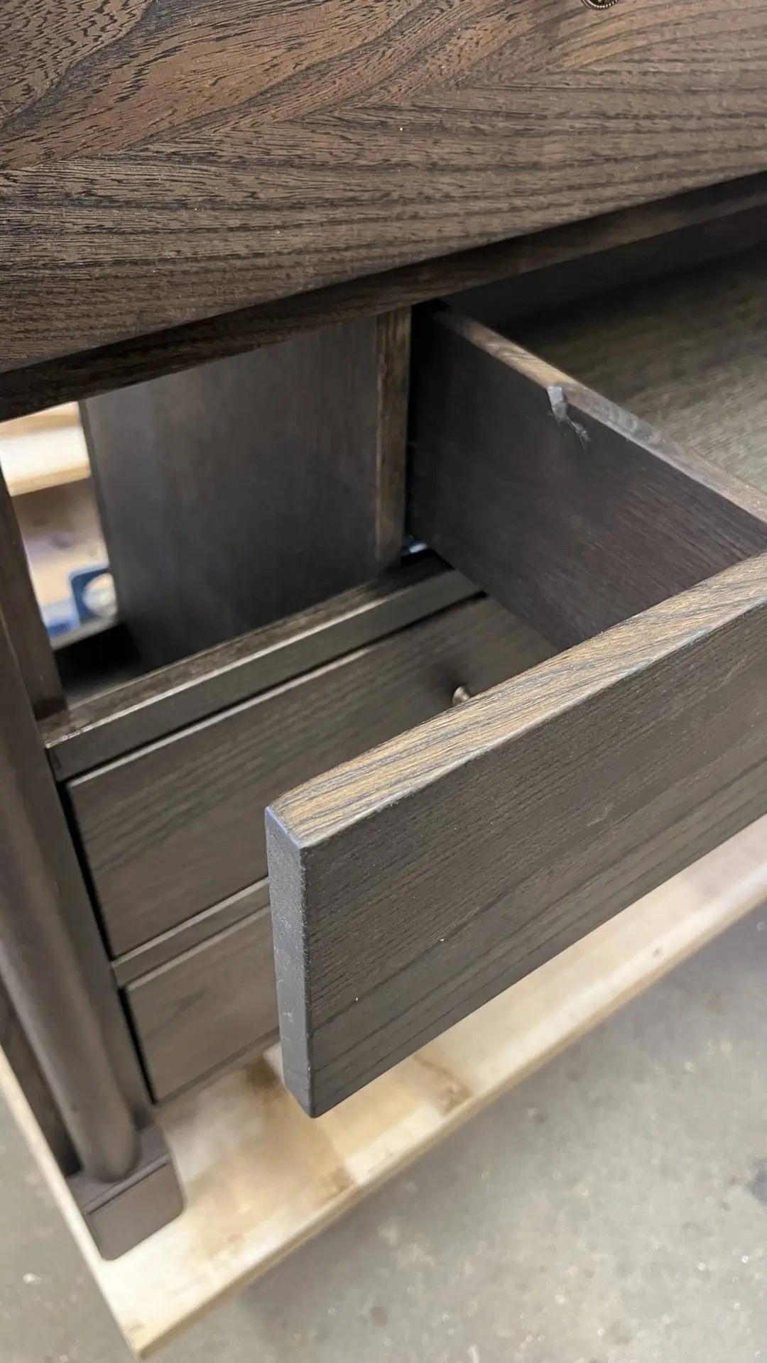 Besonders hervorzuheben sind die aysmetrisch gestalteten Schubkästen. Die Vorderstücke dienen nicht nur als stilvolle Blende, sondern verbergen auch ein verstecktes Fach. Dieses Fach ist für einen Lautsprecher vorgesehen und sorgt so für eine unsichtbare Integration moderner Technik