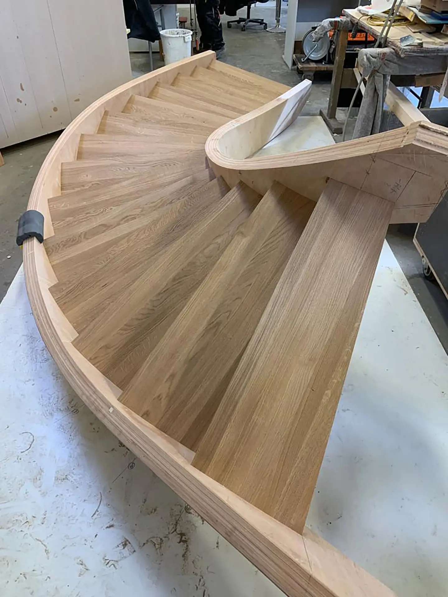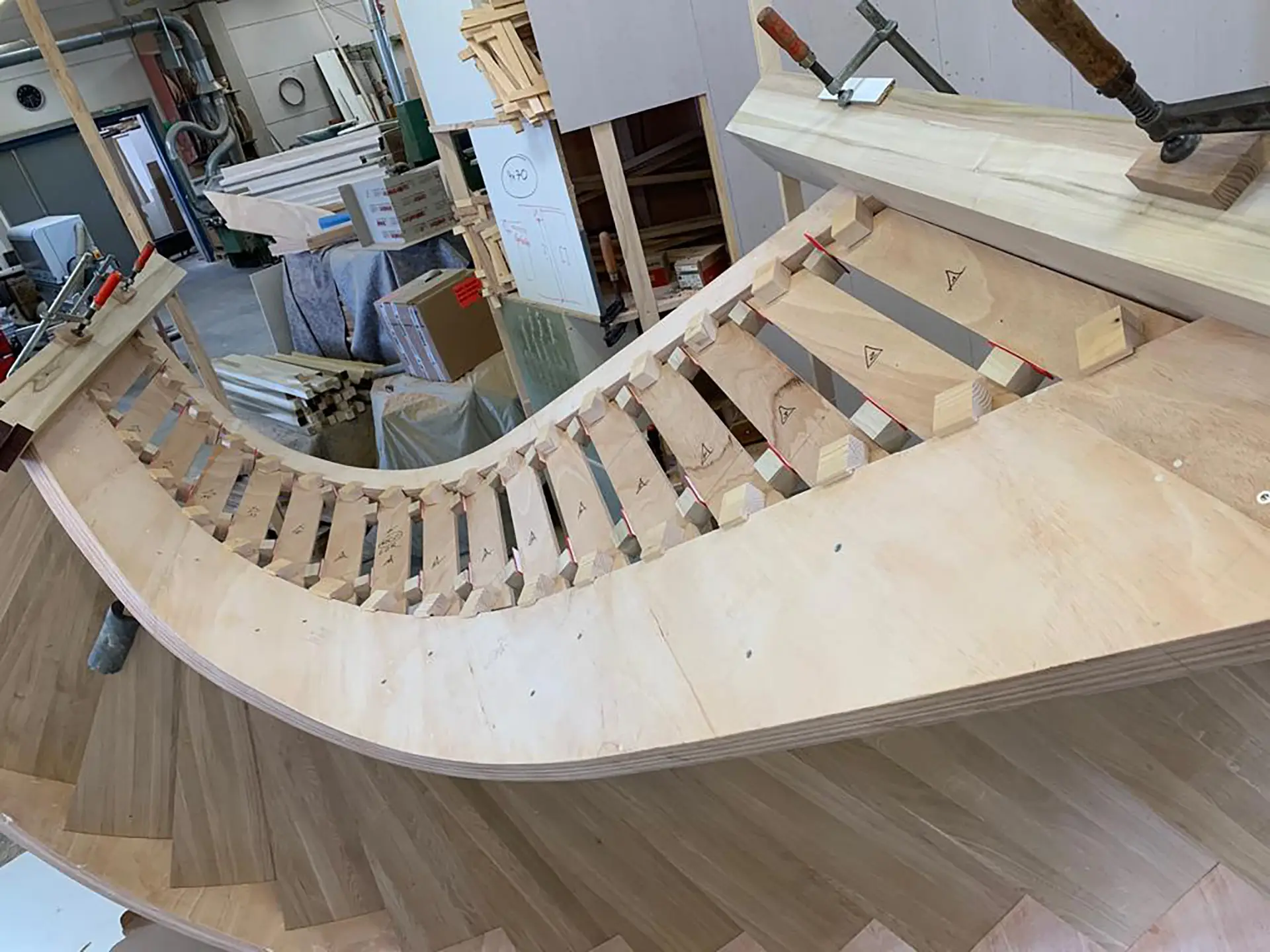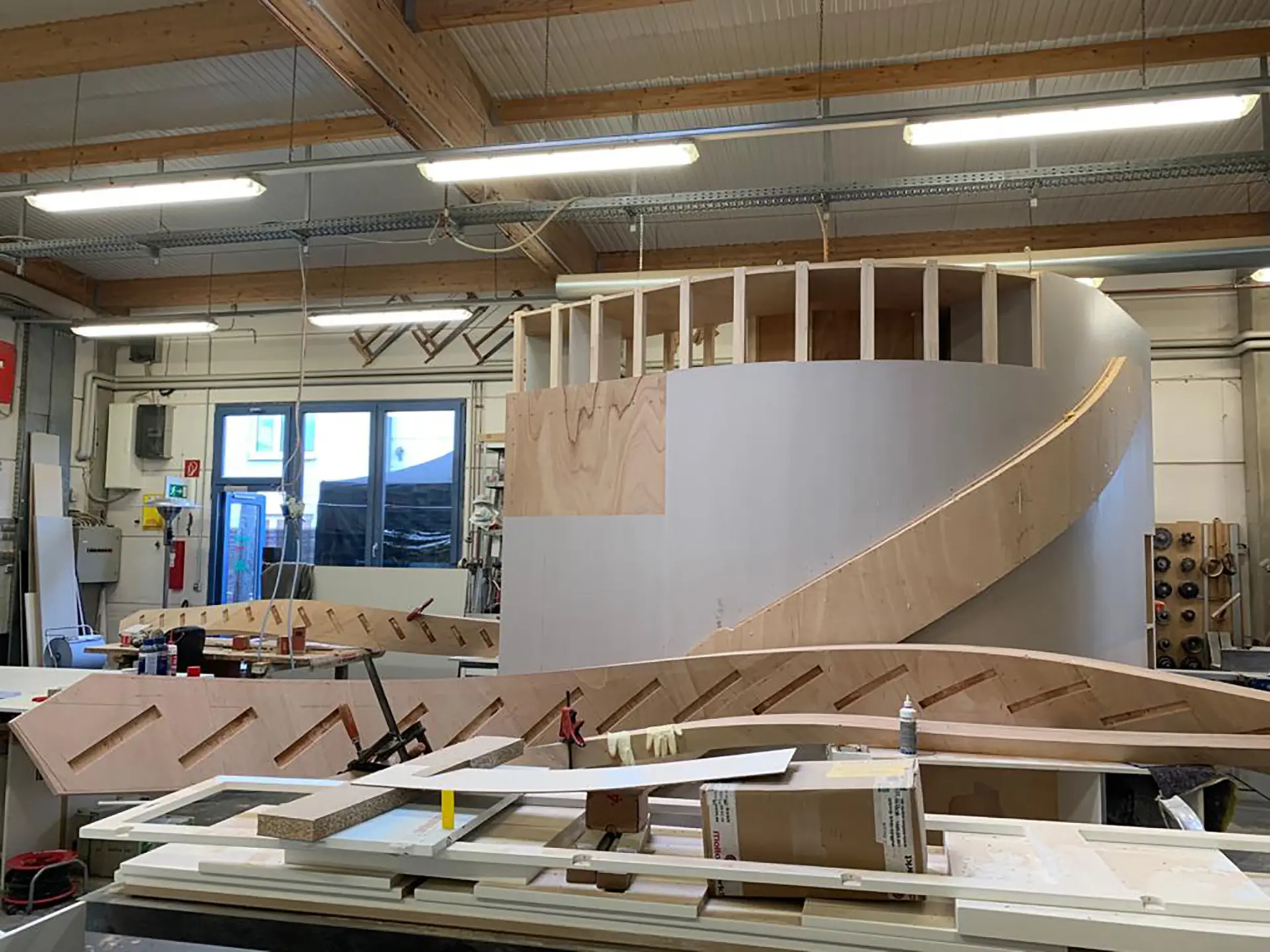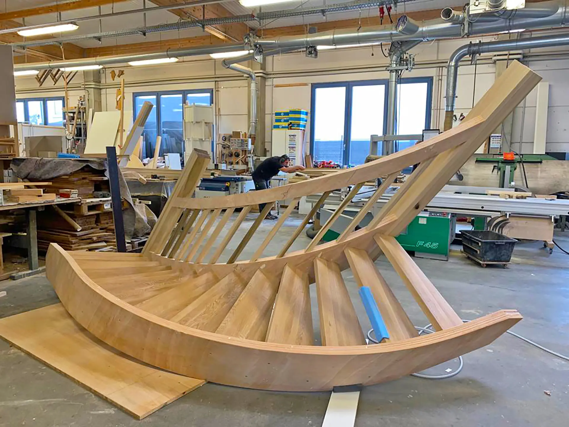 Die Striemitzer GmbH plant und fertigt Treppen nach vorgefertigten Schablonen in Formverleimung mit Rundungen nach Wunsch.