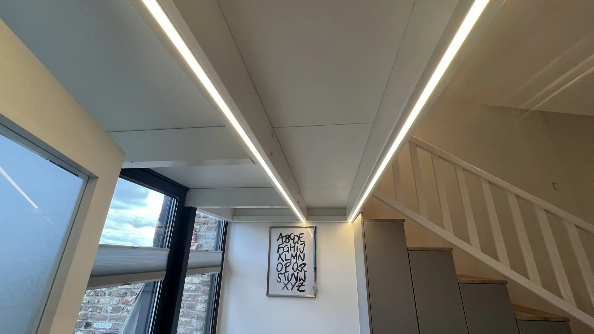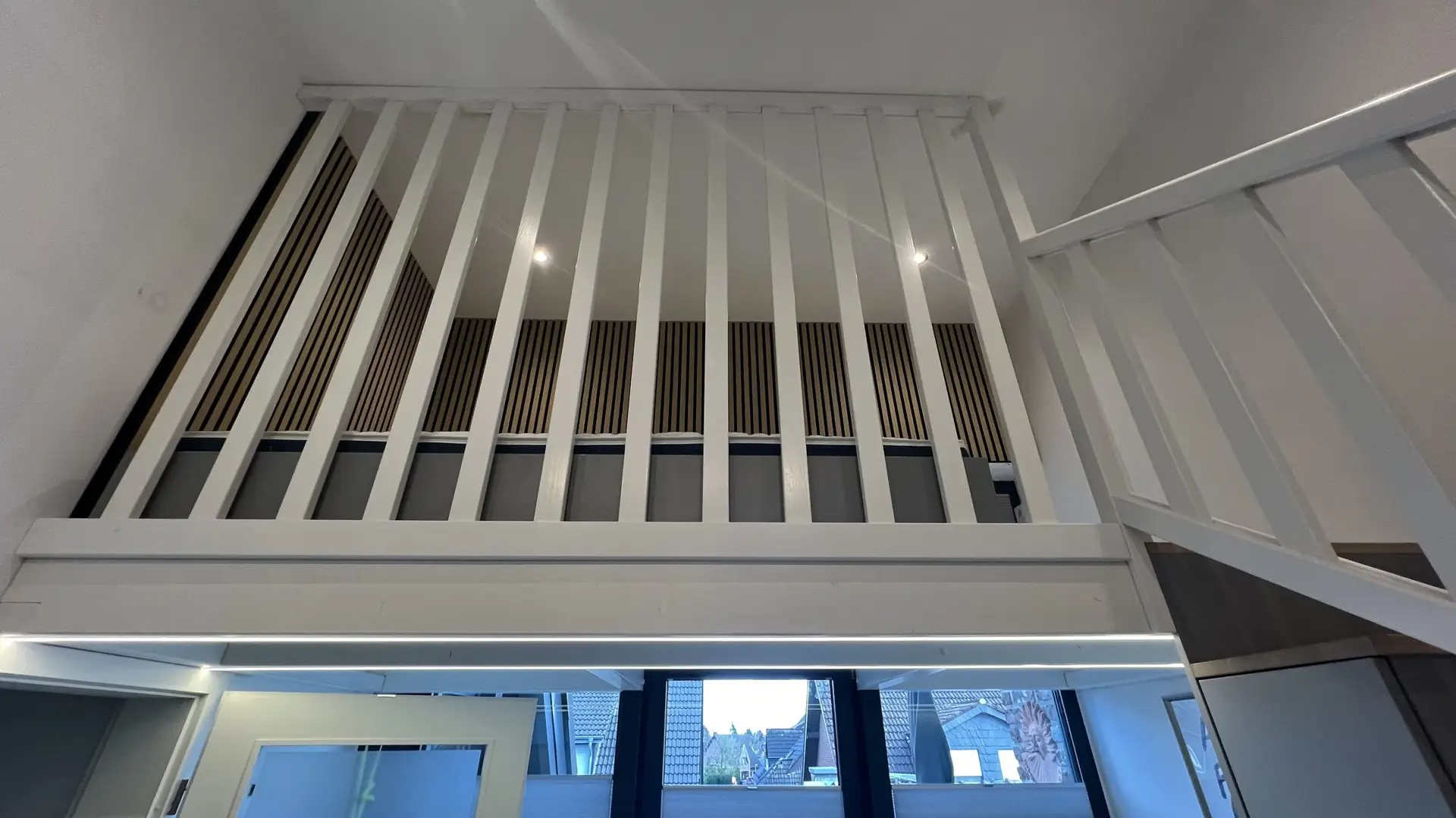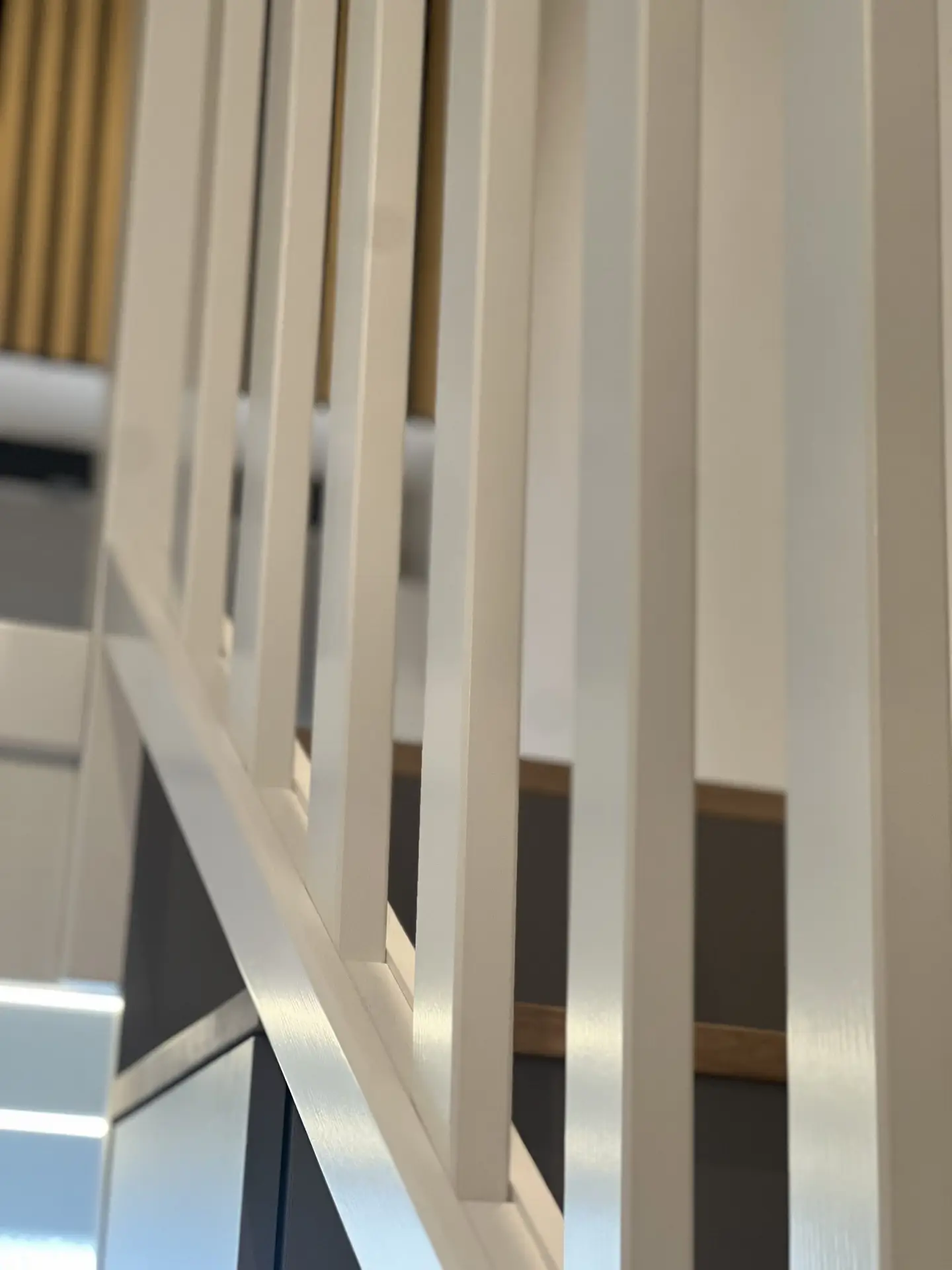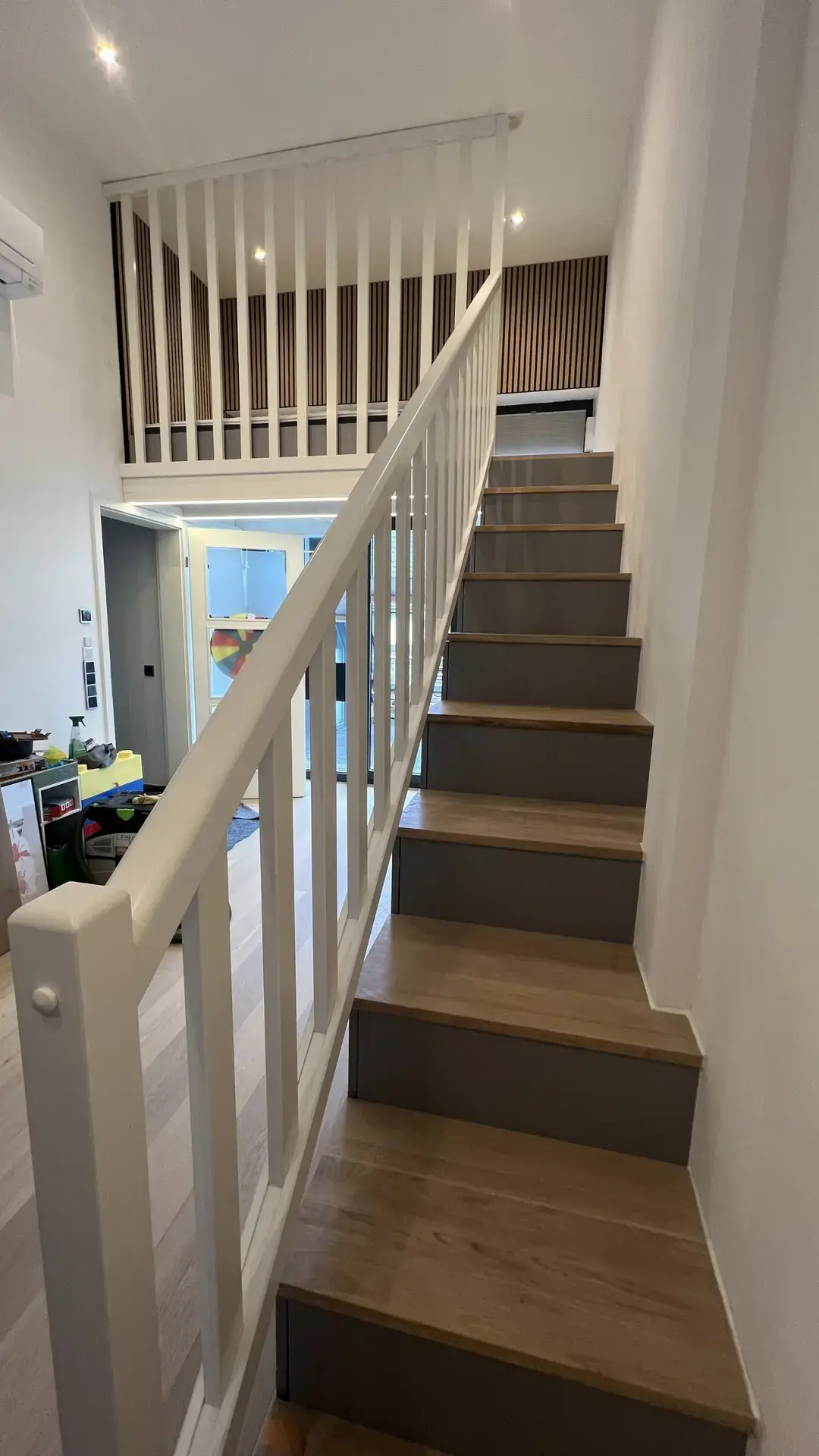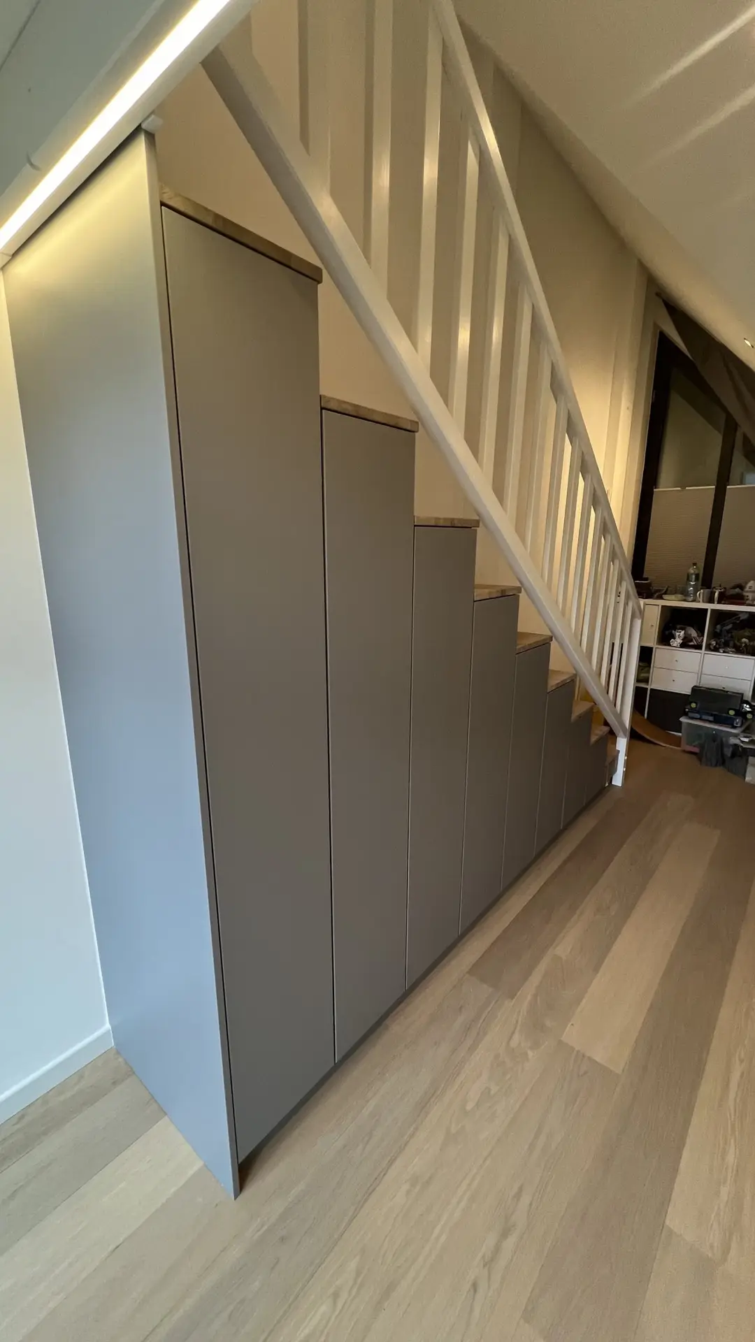 Jede Stufe dient als Deckel des darunterliegenden Schrankes, der mit schlichten grauen, grifflosen Fronten versehen ist. Diese moderne und platzsparende Lösung fügt sich nahtlos in den Raum ein und schafft eine harmonische Atmosphäre.