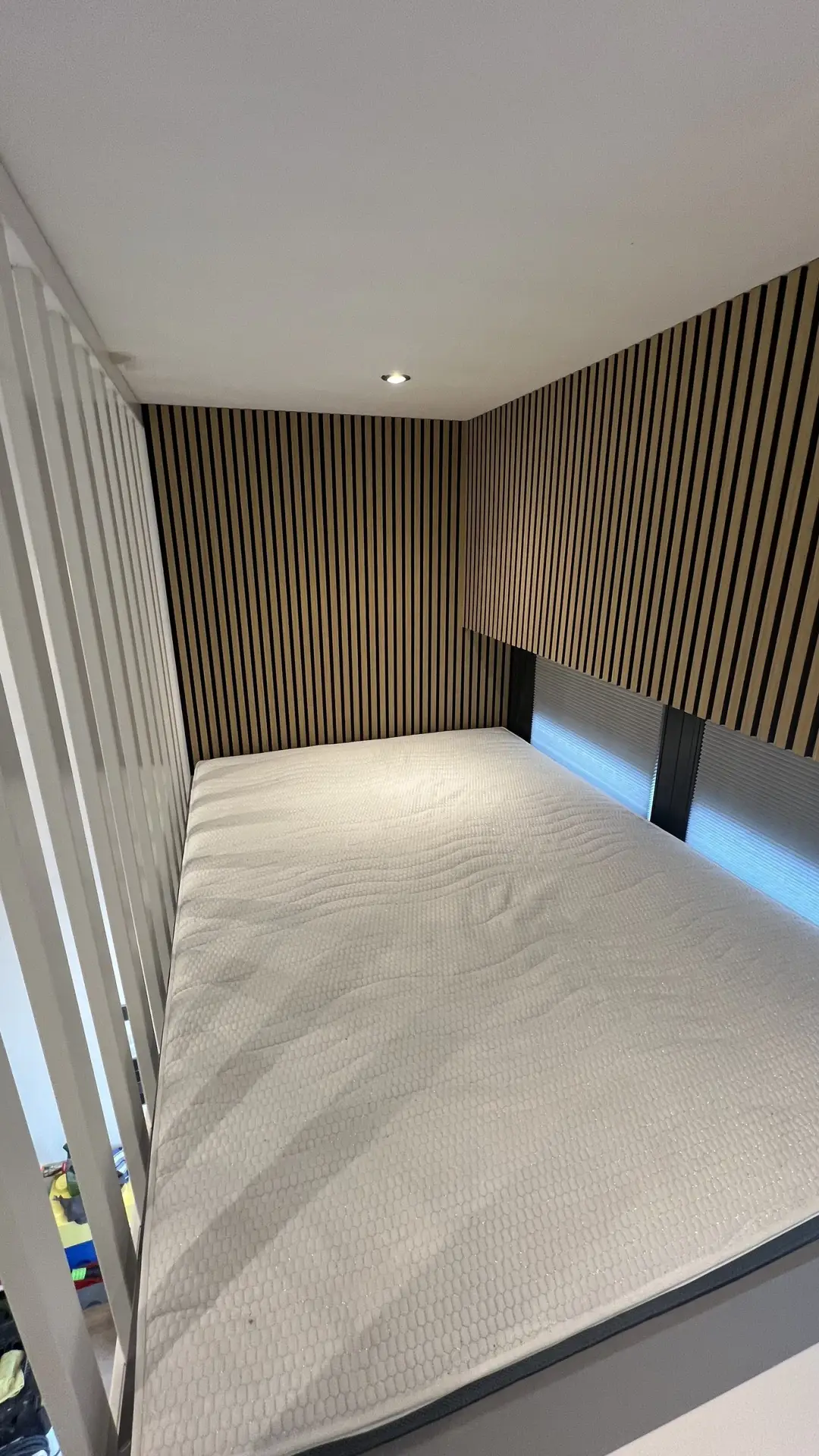 Entdecken Sie unsere innovative Schrank-Treppen-Kombination, die zu einem gemütlichen Hochbett führt. Die neun Treppenstufen aus massiver Eiche passen perfekt zu dem Eichenparkett und bieten gleichzeitig eine elegante um das Hochbet zu erreichen.