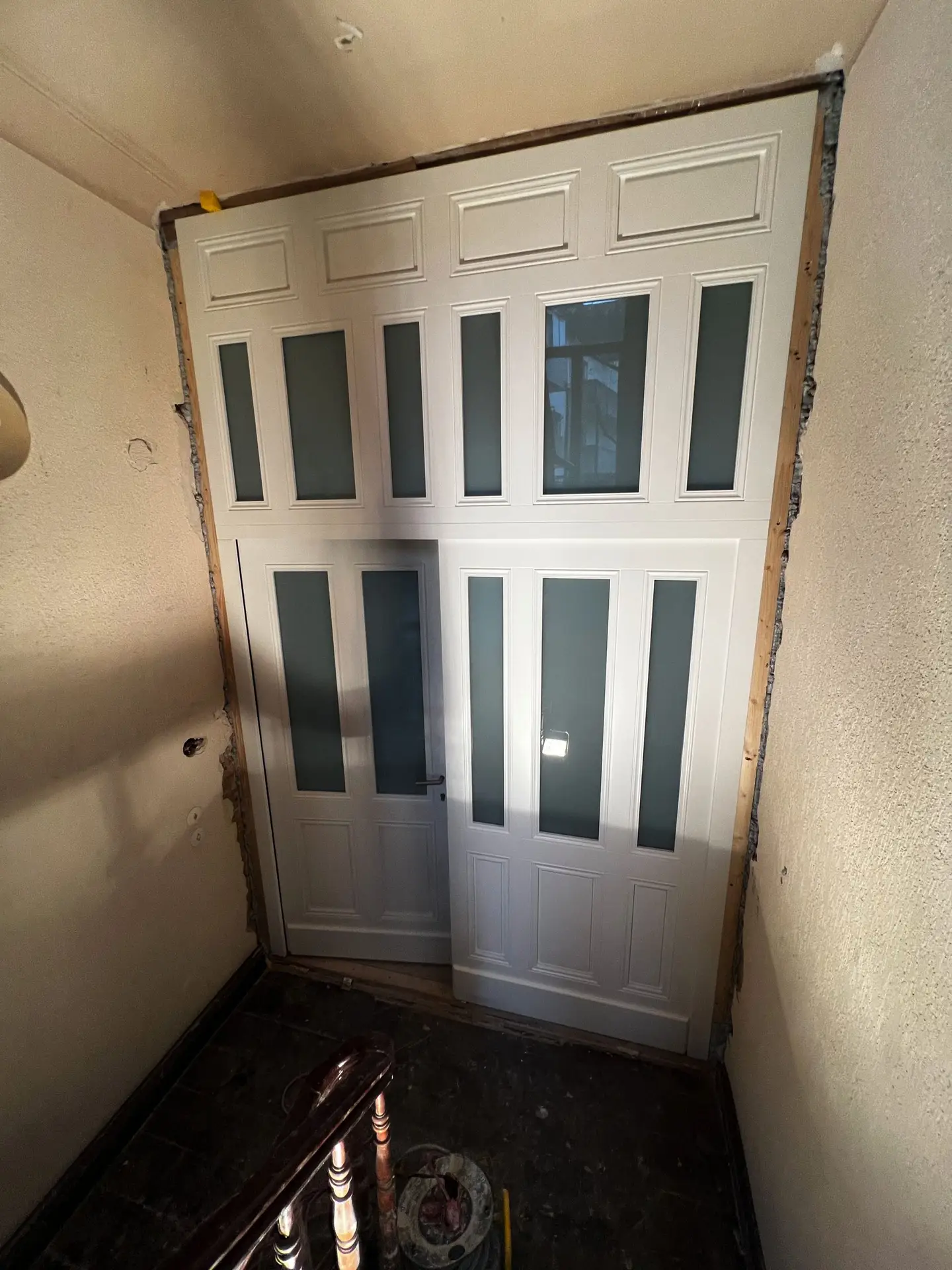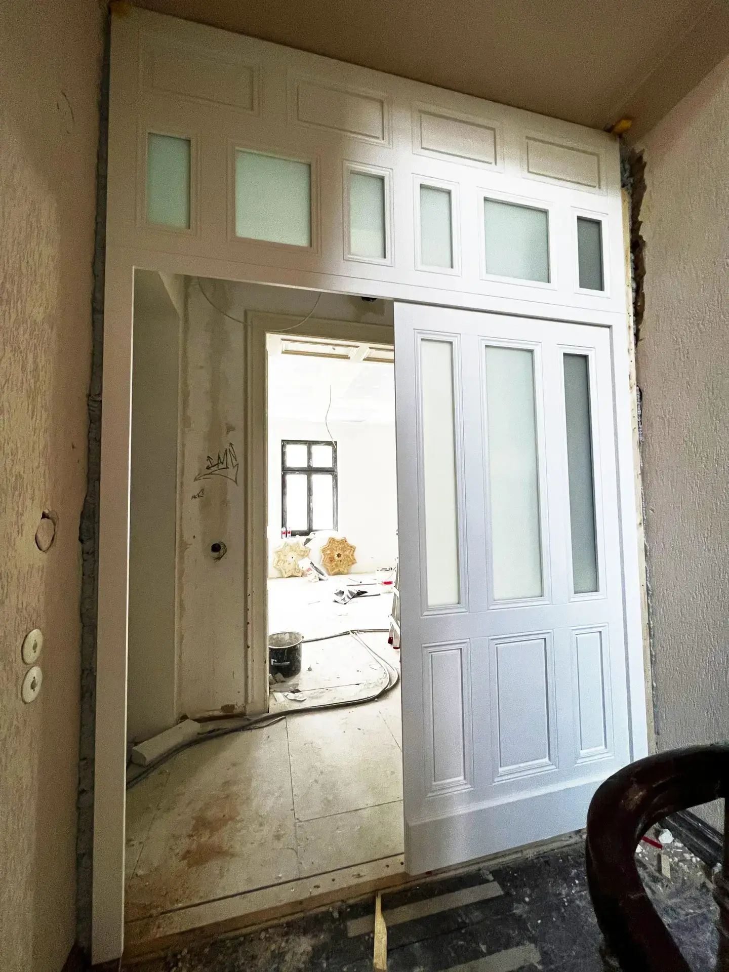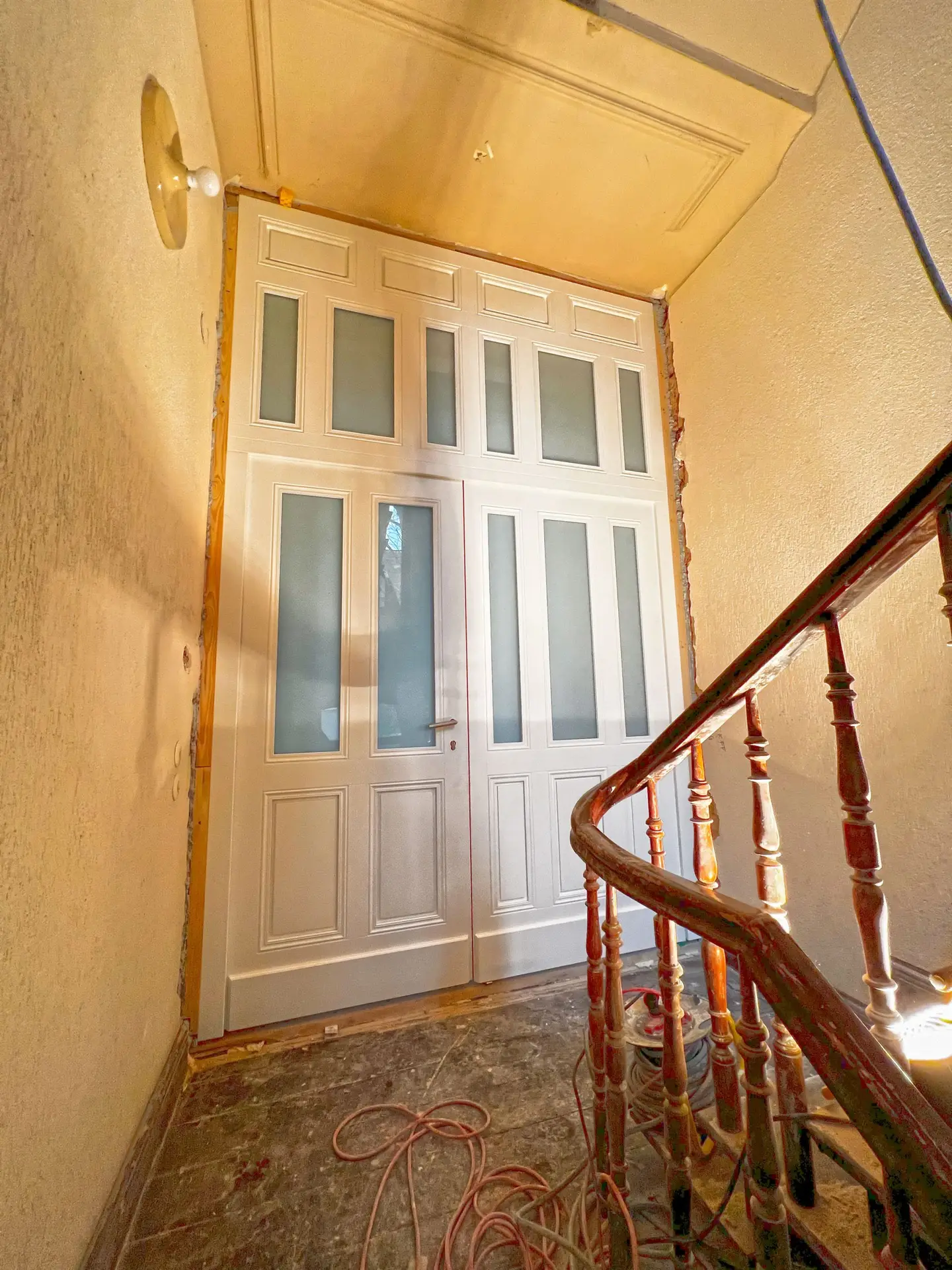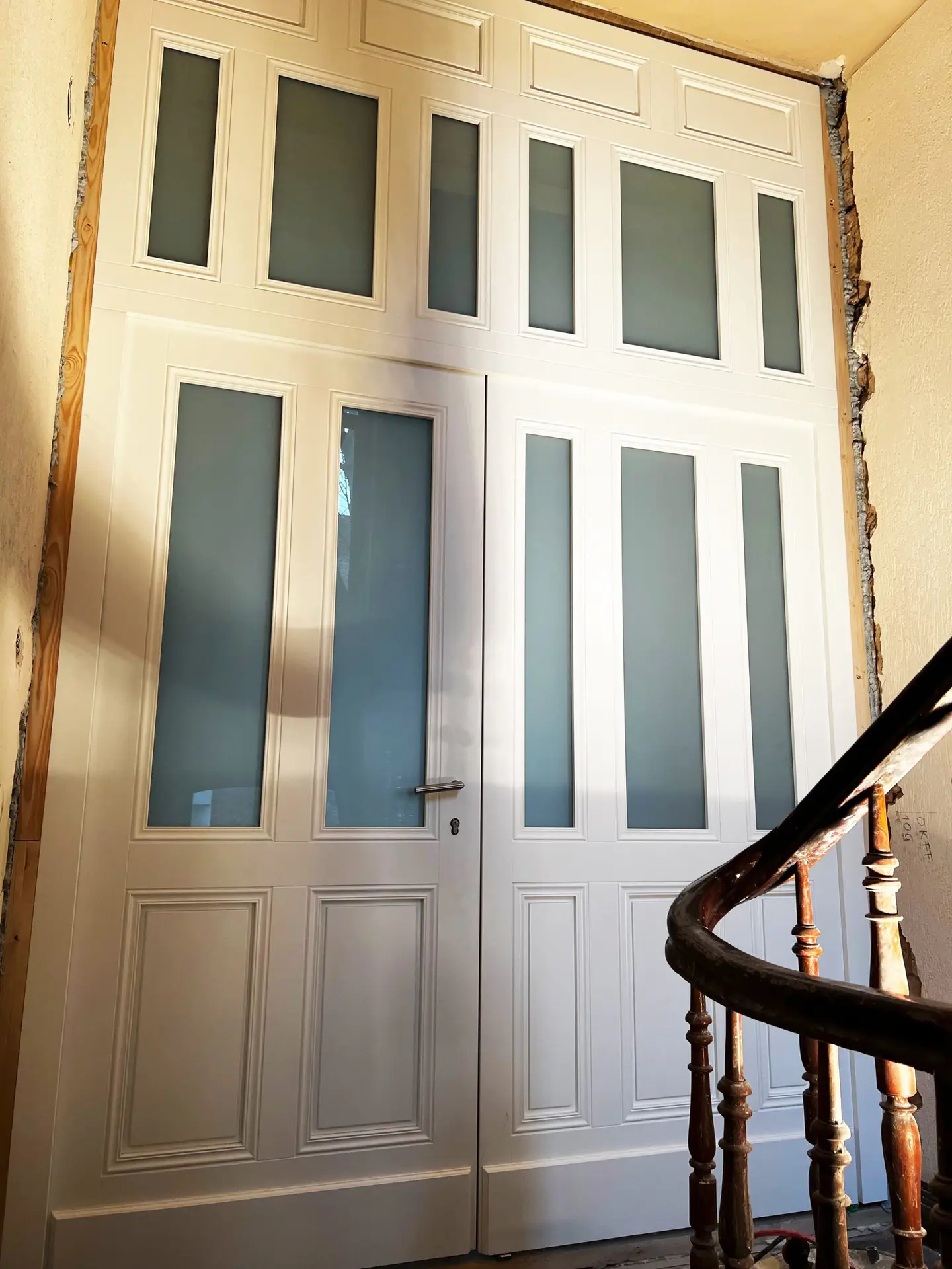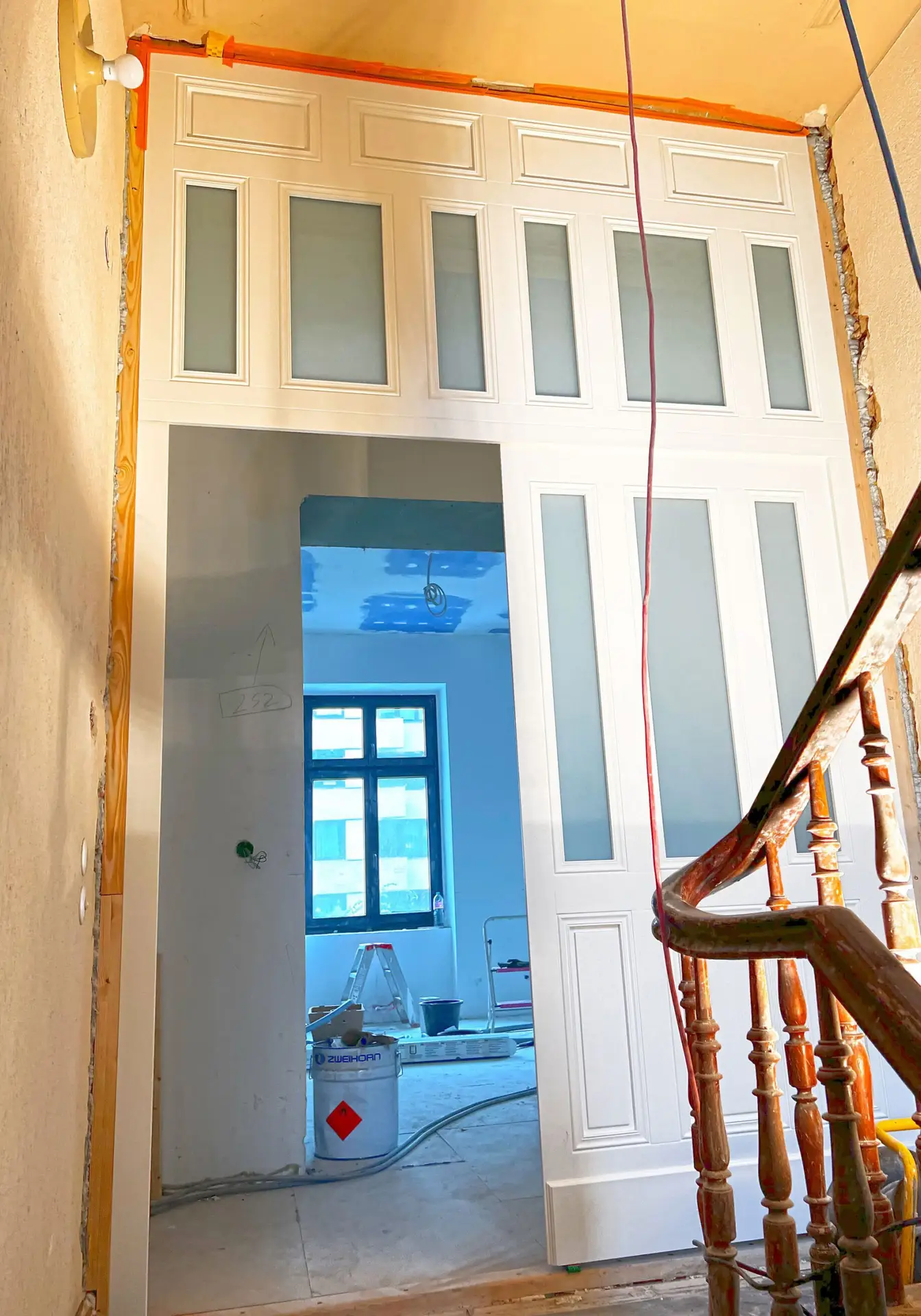 Im Rahmen einer Altbaurenovierung haben wir 11 einflügelige und doppelflügelige Stil-Massivholztürelemente in Rahmenbauweise aus Tulpa massiv Holz, mit den Maßen 750-980×2020-2640mm, mit Füllungen, Aufsatzleisten, Kanelierungen, teilweise satinierten Glasfüllungen incl. Türfutter bzw. Blendrahmen mit Beschlag, Dichtung und Schloß fachgerecht nach Muster und Vorlage angefertigt, geliefert und montiert. Die Oberfläche der Türelemente ist grundiert und lackiert. Die Fertigung erfolgte nach Kundenwunsch, sowie passend zu den vor Ort noch vorhandenen Türelementen.